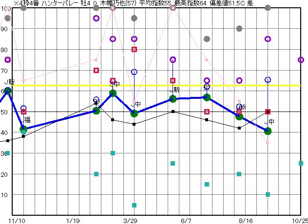 | 4枠4番 | × | 予想 52 平均 55 |