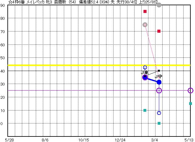| 6 | メイレベッカ グラフ表示 | 斎藤新(54) 牝3 先 | ☆ | 30 34 | J中山 1200 23/03/11 4R 31上り8 12/16 | J東京 1400 23/02/11 2R 35上り43 4/16 | | | |