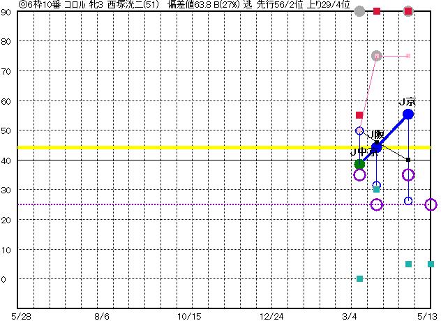 | 10 | コロル グラフ表示 | 西塚洸(51) 牝3 逃 | ◎ | 46 47 | J京都 1400 23/04/23 2R 55上り26 4/16 | J阪神 1200 23/03/26 2R 44上り31 4/16 | J中京 芝1400 23/03/11 4R 39上り50 9/18 | | |