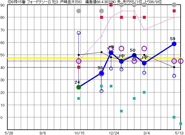 | 8 | トーセンサウダージ グラフ表示 | 大野拓(56) 牡3 先 | ▲ | 47 46 | J東京 1400 23/04/30 2R 49上り55 3/16 | J中山 1800 23/04/08 6R 54上り49 2/15 | J中山 1200 23/03/25 2R 43上り44 6/16 | J中山 1200 23/03/11 2R 47上り41 5/16 | J小倉 芝1200 23/01/28 2R 41上り47 6/16 |