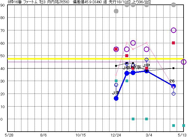 | 16 | ファートム グラフ表示 | 丹内祐(56) 牡3 追 | 29 32 | J東京 2100 23/04/22 3R 26上り20 14/15 | J中山 1800 23/02/25 3R 38上り47 7/16 | J中京 1900 23/01/28 3R 37上り42 8/15 | J中山 1800 23/01/15 3R 36上り44 7/16 | J中山 1800 22/12/24 6R 16上り27 12/16 |