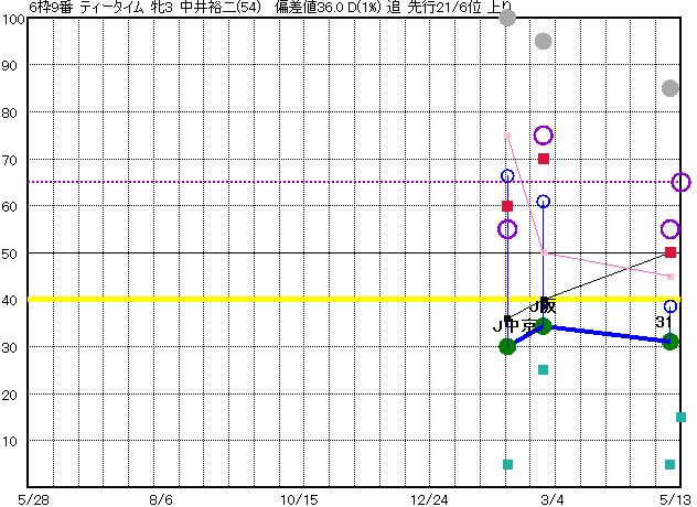 | 9 | ティータイム グラフ表示 | 中井裕(54) 牝3 追 | 15 37 | J京都 芝1600 23/05/07 4R 31上り39 12/15 | J阪神 芝2000 23/02/25 4R 34上り61 11/16 | J中京 芝1600 23/02/05 6R 30上り66 6/15 | | | |
