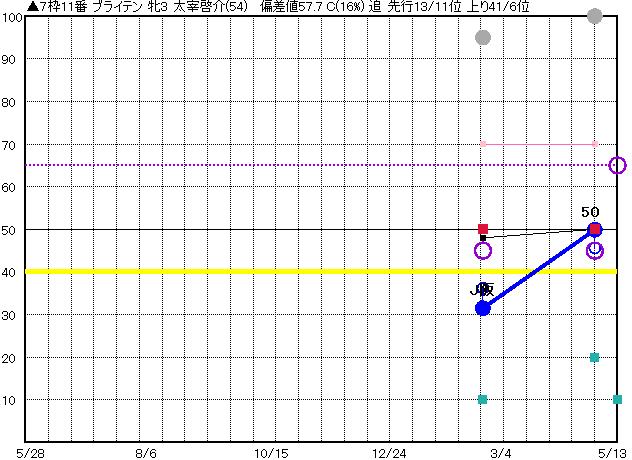 | 11 | ブライテン グラフ表示 | 太宰啓(54) 牝3 追 | ▲ | 39 41 | J京都 1400 23/04/29 1R 50上り46 7/16 | J阪神 1400 23/02/19 4R 31上り36 7/16 | | | |