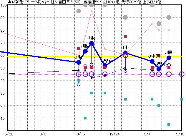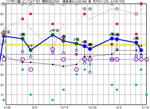 | 13 | バンベルク グラフ表示 | 藤岡佑(58) 牡5 差 | ○ | 60 61 | J京都 1400 23/04/29 8R 54上り49 2/14 | J阪神 1400 23/04/16 12R 62上り48 3/16 | J阪神 1400 23/02/25 8R 65上り55 2/16 | J阪神 1400 23/02/12 7R 66上り44 2/16 | J阪神 1400 22/12/17 8R 55上り32 4/15 |