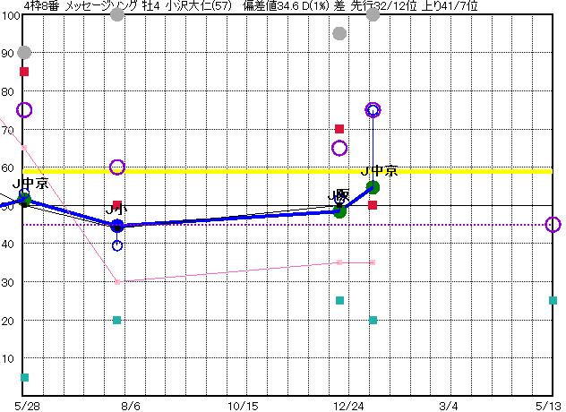 | 8 | メッセージソング グラフ表示 | 小沢大(57) 牡4 差 | 25 51 | J中京 芝2000 23/01/09 12R 55上り75 14/14 | J阪神 芝1800 22/12/17 12R 48上り52 14/15 | J小倉 1700 22/07/17 12R 45上り39 15/15 | J中京 芝2000 22/05/14 9R 52上り53 8/9 | J阪神 1800 22/02/27 2R 44上り44 1/15 | |