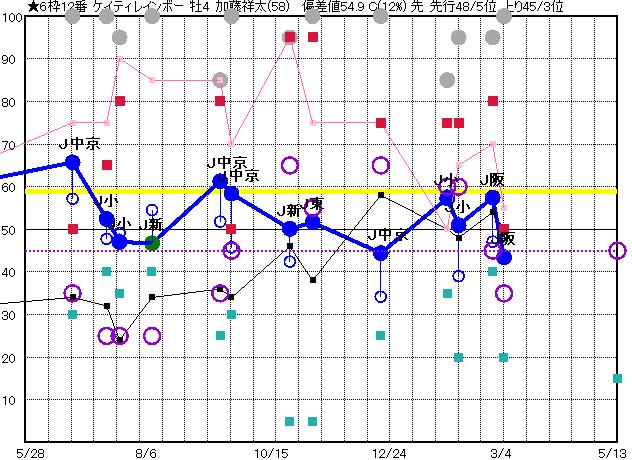 | 12 | ケイティレインボー グラフ表示 | 加藤祥(58) 牡4 先 | ★ | 50 53 | J阪神 1200 23/03/04 8R 43上り43 10/15 | J阪神 1400 23/02/25 8R 57上り47 7/16 | J小倉 1700 23/02/04 7R 51上り39 8/13 | J小倉 1700 23/01/28 7R 57上り58 11/15 | J中京 1800 22/12/18 8R 44上り34 6/10 |