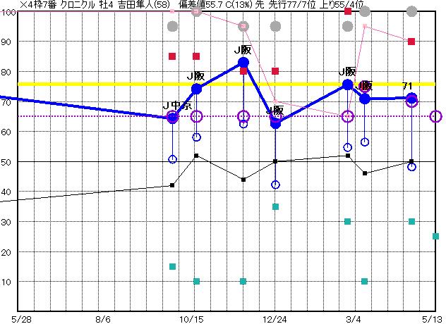 | 7 | クロニクル グラフ表示 | 吉田隼(58) 牡4 先 | × | 72 72 | J京都 1900 23/04/22 10R 71上り48 3/16 | J阪神 2000 23/03/12 10R 71上り56 2/15 | J阪神 1800 23/02/25 10R 76上り55 8/16 | J阪神 1800 22/12/24 10R 63上り42 7/16 | J阪神 1800 22/11/26 10R 83上り62 2/16 |