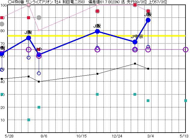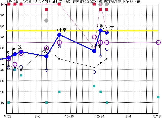 | 12 | サンマルレジェンド グラフ表示 | 酒井学(58) 牡5 逃 | 67 62 | J中京 1800 23/01/09 10R 74上り59 6/16 | J阪神 1800 22/12/25 9R 76上り53 1/15 | J中京 1900 22/12/10 10R 57上り38 9/16 | J中京 1800 22/09/17 6R 72上り61 1/12 | 名古 1700 22/08/17 8R 52上り40 1/10 | |