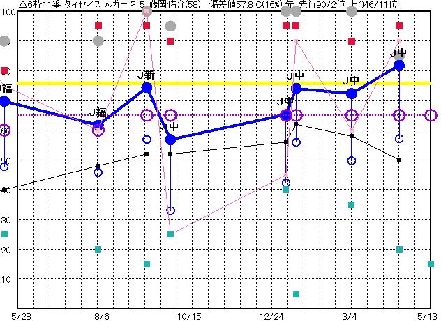 | 11 | タイセイスラッガー グラフ表示 | 藤岡佑(58) 牡5 先 | △ | 74 69 | J中山 1800 23/04/15 10R 82上り57 3/15 | J中山 1800 23/03/04 10R 72上り50 9/16 | J中山 1800 23/01/14 10R 74上り56 3/12 | J中山 1800 23/01/05 9R 65上り42 12/12 | J中山 1800 22/09/25 10R 57上り33 16/16 |