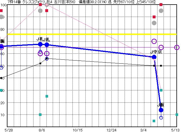 | 14 | クレスコジョケツ グラフ表示 | 古川吉(56) 牝4 逃 | 55 51 | J阪神 1800 23/04/09 12R 14上り8 15/15 | J中京 1900 23/03/25 11R 57上り58 10/16 | J札幌 1700 22/08/06 10R 67上り56 1/14 | J札幌 1700 22/07/23 12R 68上り62 1/10 | J阪神 1800 22/04/30 5R 66上り48 7/14 | |