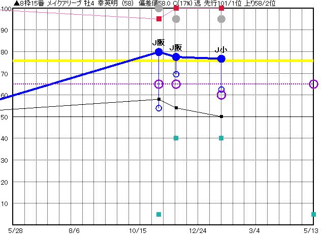 | 15 | メイクアリープ グラフ表示 | 幸英明(58) 牡4 逃 | ▲ | 75 78 | J小倉 1700 23/01/21 11R 77上り63 1/16 | J阪神 1800 22/11/27 7R 78上り70 1/8 | J阪神 1800 22/11/06 7R 80上り54 2/12 | J中京 1900 22/03/19 3R 54上り56 1/16 | J阪神 1800 22/02/27 4R 48上り48 2/14 |