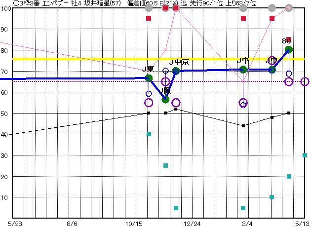 | 3 | エンペザー グラフ表示 | 坂井瑠(57) 牡4 逃 | ○ | 75 70 | J京都 芝1800 23/04/23 10R 80上り69 1/14 | J中山 芝2000 23/04/02 11R 71上り70 2/13 | J中山 芝1600 23/02/25 11R 71上り54 8/16 | J中京 芝1600 22/12/03 10R 70上り70 1/10 | J阪神 芝1800 22/11/20 10R 57上り70 5/11 |