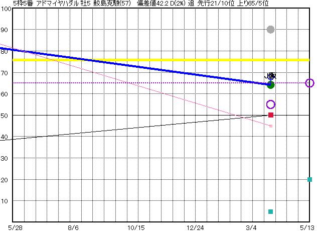 | 5 | アドマイヤハダル グラフ表示 | 鮫島克(57) 牡5 追 | 58 66 | J阪神 芝1600 23/03/26 11R 64上り68 12/15 | J中山 芝1800 22/02/27 11R 84上り57 3/16 | J東京 芝2000 22/01/29 11R 83上り71 2/14 | J中山 芝1800 21/12/19 11R 71上り65 5/16 | J東京 芝2400 21/05/30 11R 59上り51 17/17 | |