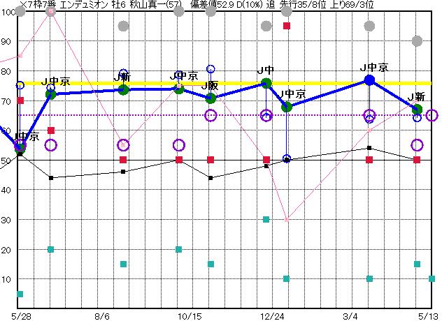 | 7 | エンデュミオン グラフ表示 | 秋山真(57) 牡6 追 | × | 68 72 | J新潟 芝1600 23/04/30 11R 67上り64 7/14 | J中京 1800 23/03/19 11R 77上り64 9/16 | J中京 芝3000 23/01/05 10R 68上り50 15/16 | J中山 芝1800 22/12/18 11R 76上り64 11/16 | J阪神 芝1800 22/10/30 11R 71上り81 6/15 |